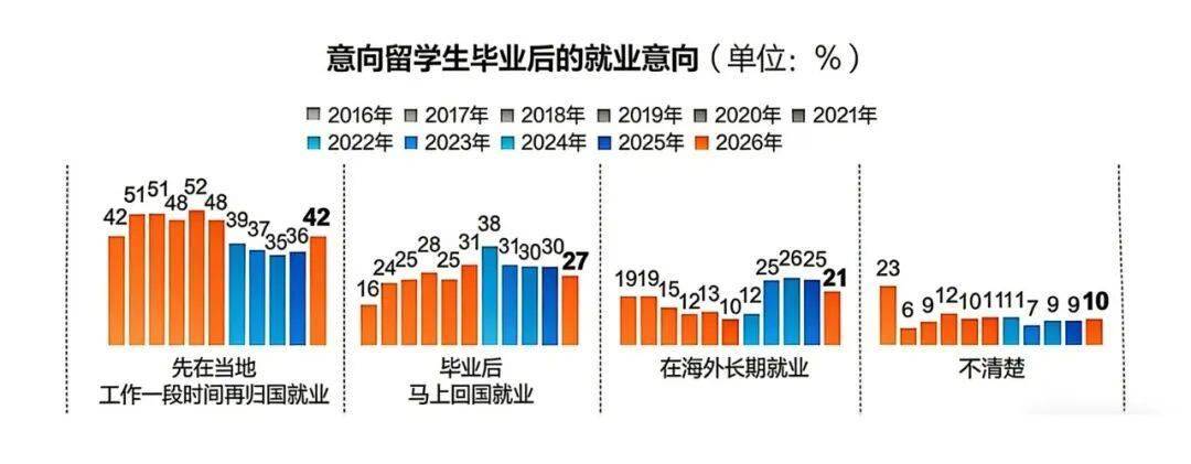 从意向留学生毕业后的就业意向来看,42%的学生选择先在当地工作再归国就业;27%的学生希望毕业后马上回国就业;21%的学生选择在海外长期就业,占比保持稳定。