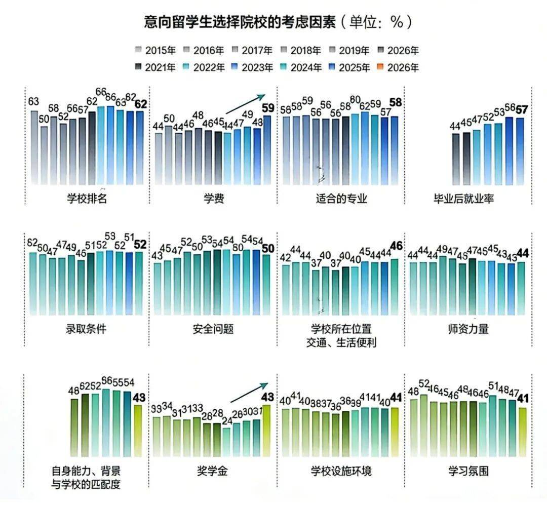 留学生择校最看重的四大因素中,学校排名占比62%居首,适合的专业、毕业后就业率、学费成本分别占比58%、57%、48%。