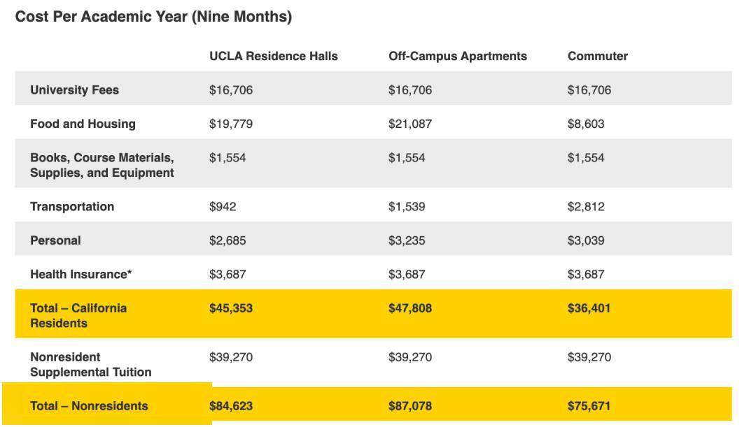 UCB本州学费为18134美元,国际生和州外学生要57404美元;UCLA的两者分别是16706美元和55976美元,国际生总费用高达84623美元;UCD国际生的总成本为88279美元;UCSD则是88,279美元。